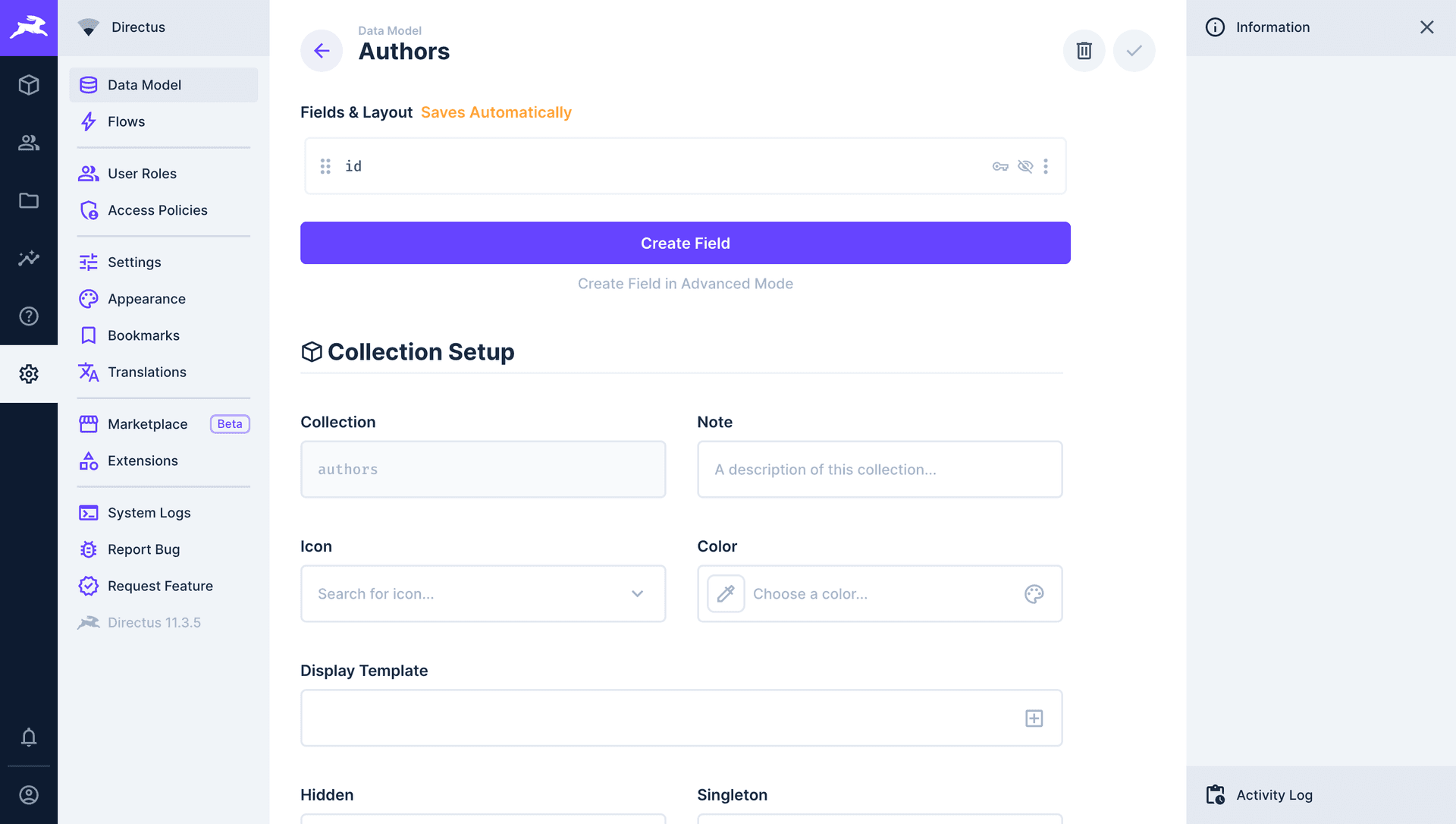 Configure the authors schema in Directus CMS